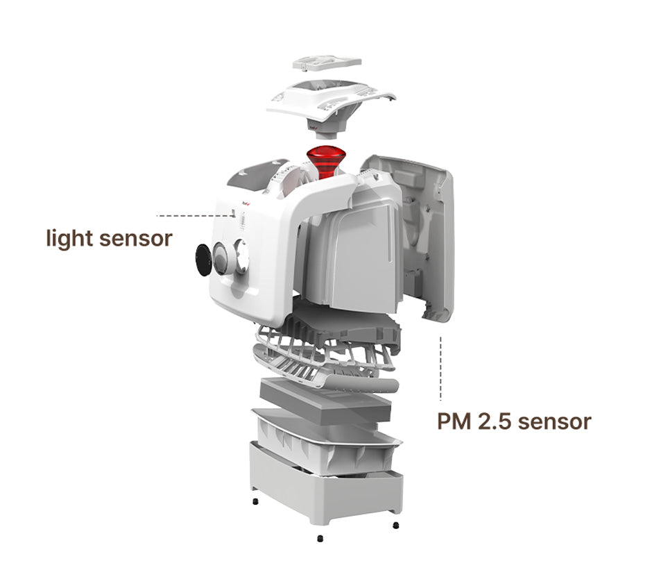 The light sensor detects light and automatically lowers the noise level and lighting light at night to quietly purify the air.