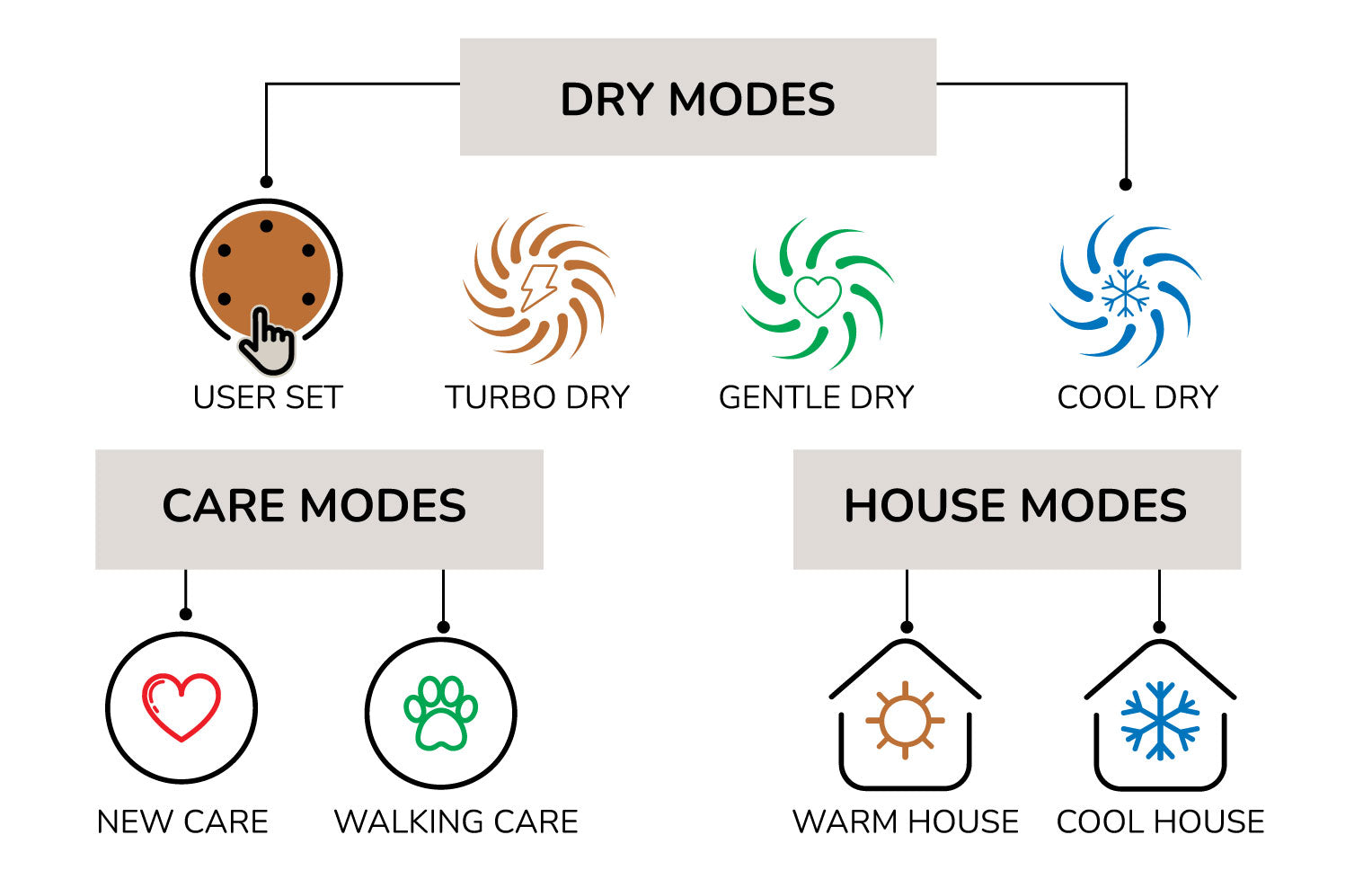 Care modes offers a soothing air-shower perfect for young, senior and delicate pets.