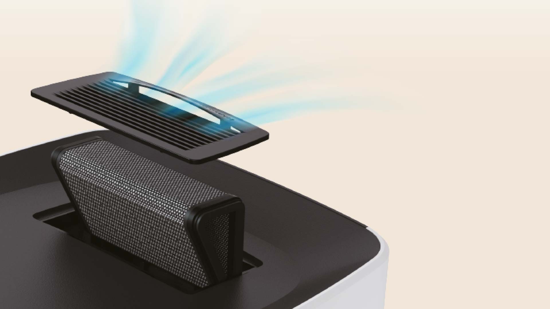 Air Intake & Filtration: Air is drawn into the unit from the top and passes through an "ALL-IN-ONE FILTER" to ensure clean air circulates inside.